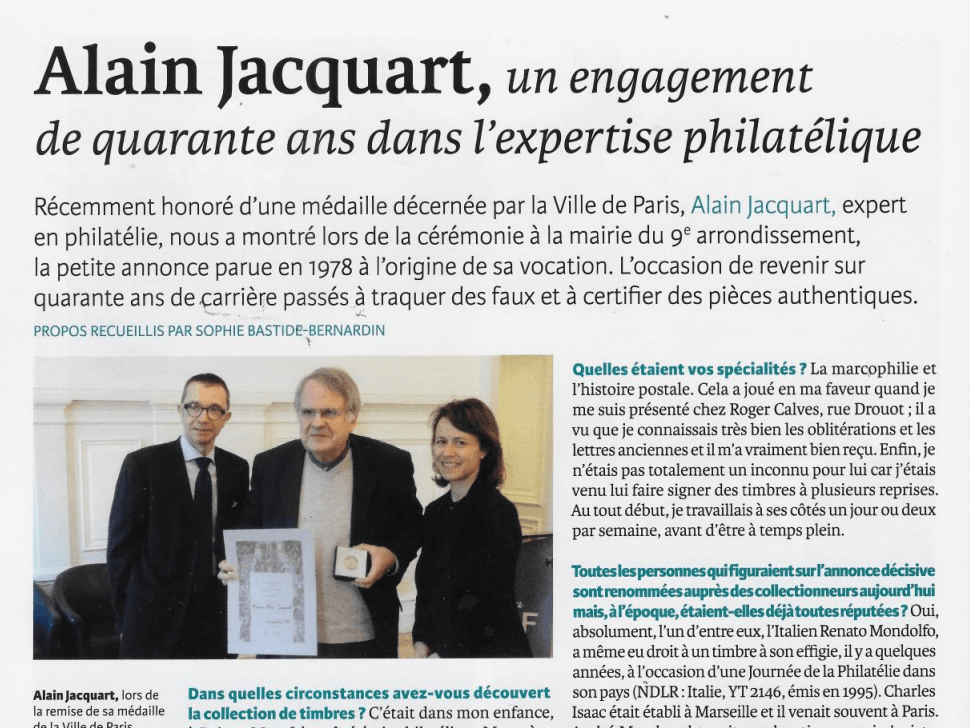 Récemment honoré d'une médaille décernée par la Ville de Paris, Alain Jacquart a fait l'objet d'un article dans le dernier numéro de l'Echo de la Timbrologie. L'occasion de revenir sur quarante ans de carrière passés à traquer des faux et à certifier des pièces authentiques.