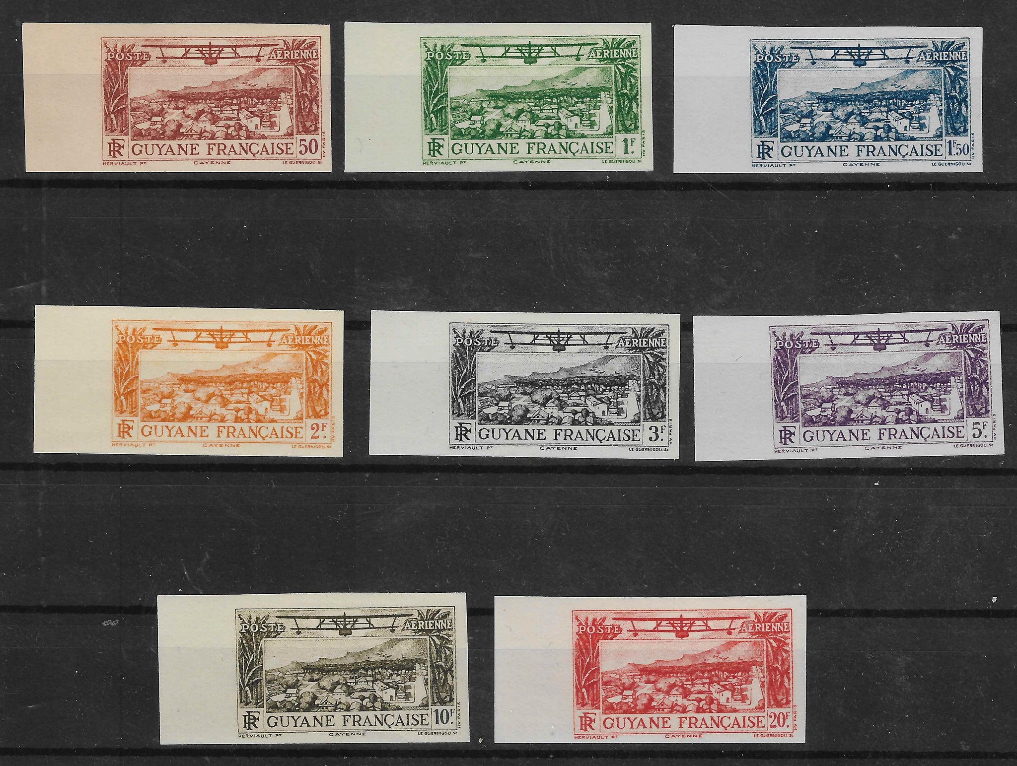 Superbes exemplaires des timbres de poste aérienne de Guyane n°12 à 18. Non dentelés. Neufs avec gomme d'origine sans charnière. Bords de feuille. Cote Yvert et Tellier 2025 = 380 €.