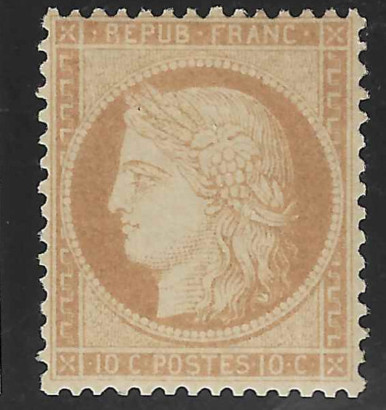 Très bel exemplaire du timbre de France n°36. Cérès - 10 c. bistre-jaune. Neuf avec gomme d'origine; trace de charnière. Cote Yvert et Tellier 2026 = 1 000 .