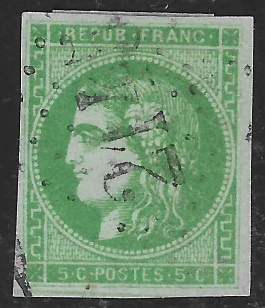 Très bel exemplaire du timbre de France n°42B. 5 c. vert-jaune report 2. Oblitéré gros chiffres. Cote Yvert et Tellier 2026 = 220 €.