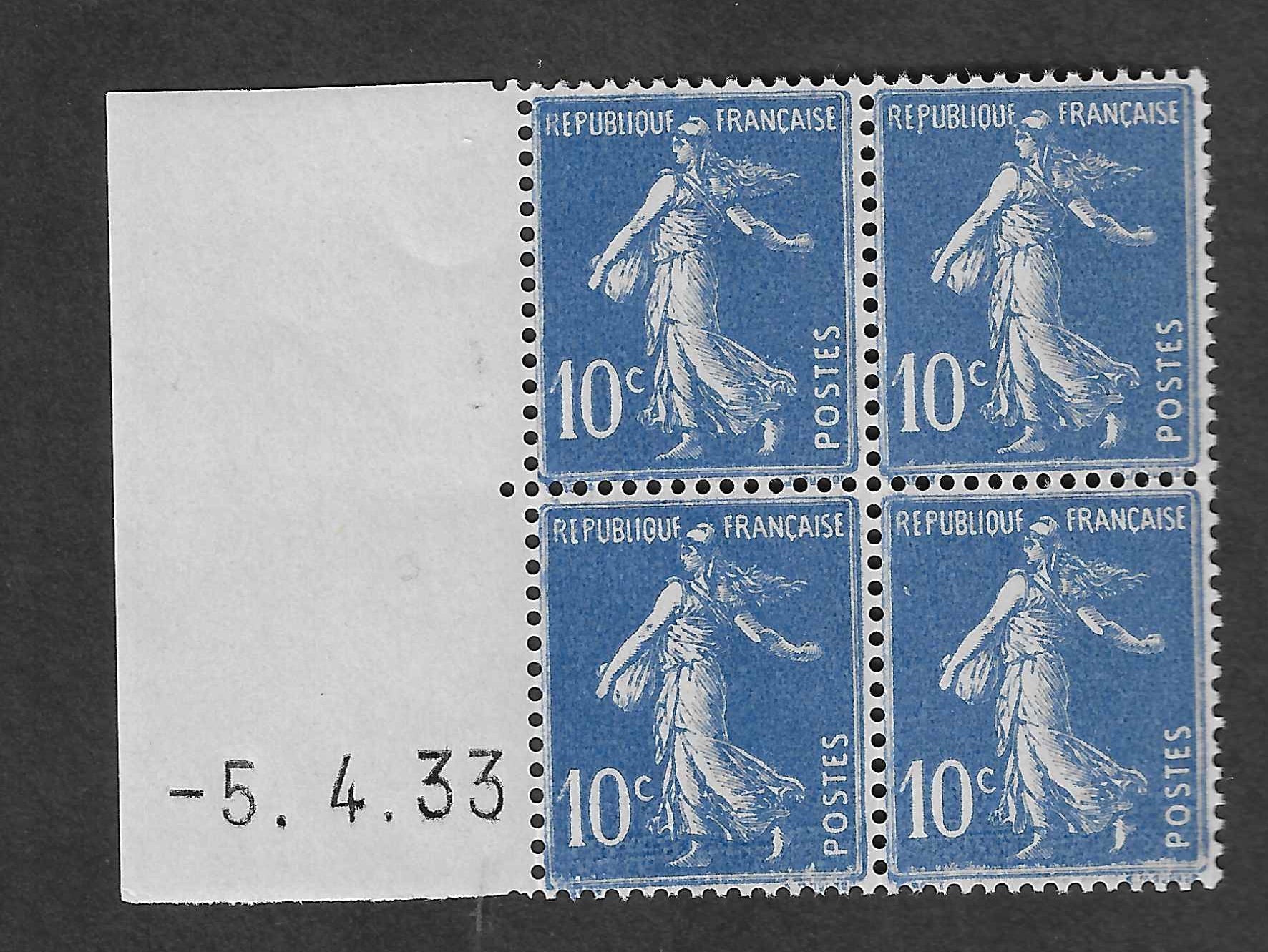 Superbes exemplaires du timbre de France n°279 en bloc de 4 exemplaires coin daté à gauche du 5/4/1933. Neuf avec gomme d'origine sans charnière. Cote Yvert et Tellier 2026 = 135 €.