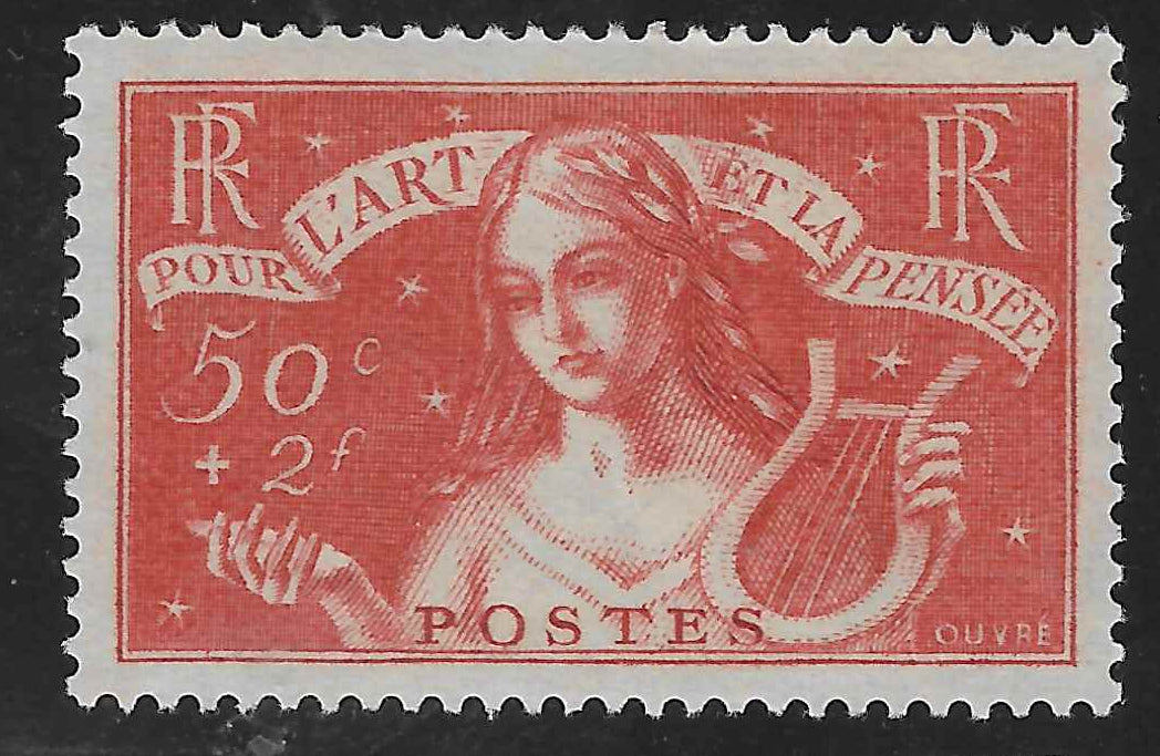 Superbe exemplaire du timbre de France n°308 - Art et la pensée. Neuf avec gomme d'origine sans charnière. Cote Yvert et Tellier 2025 = 135 €.
