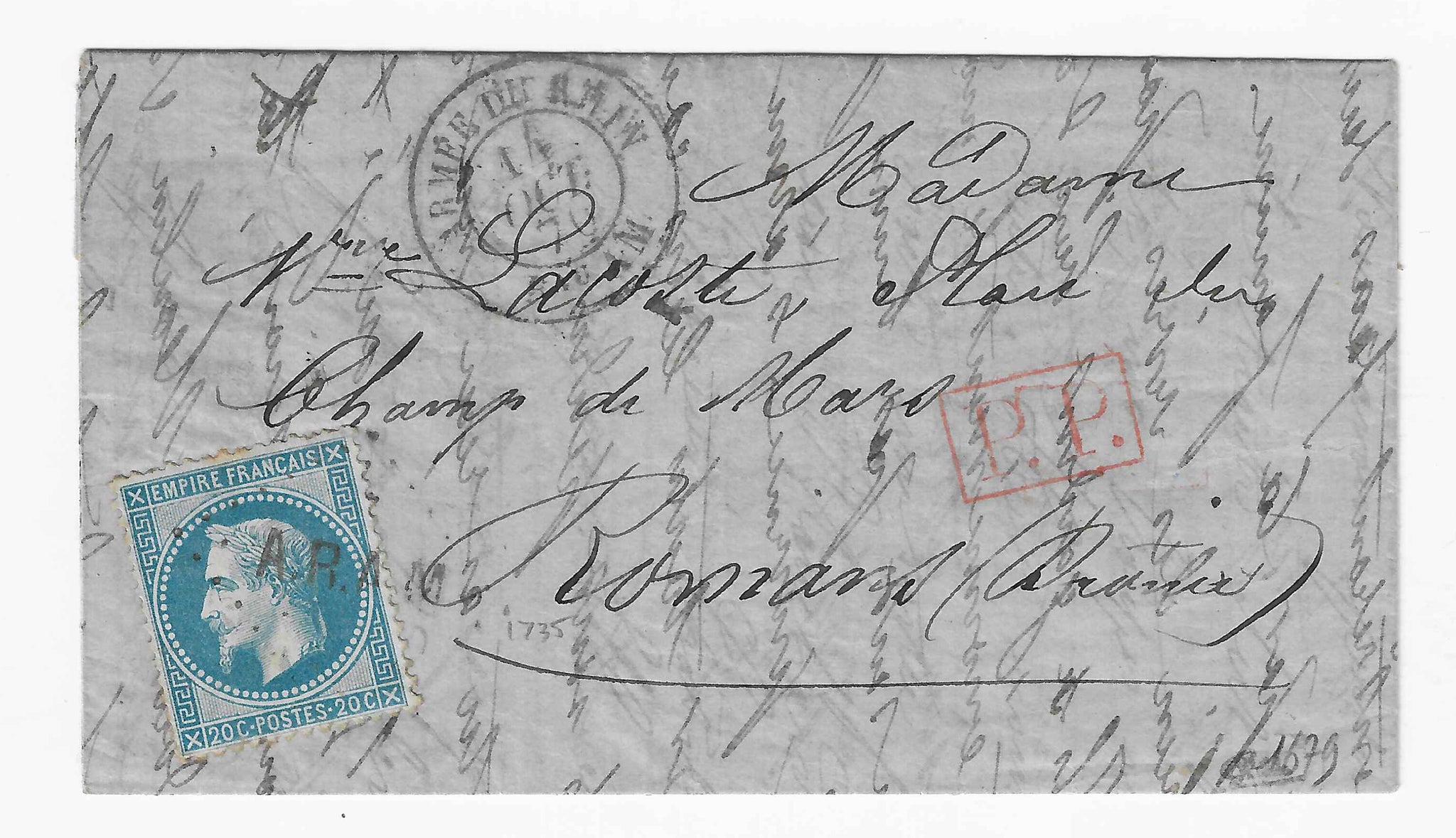 N°29B - 20 c. bleu. Oblitéré A.R.A.M. sur lettre par ballon monté avec cachet à date du 14 octobre 1870 Armée du Rhin Bau AM pour Romans. Au verso : cachet d'arrivée de Romans du 21 octobre 1870. Oblitération rare. Cote Yvert et Tellier 2026 = 3 000 €.