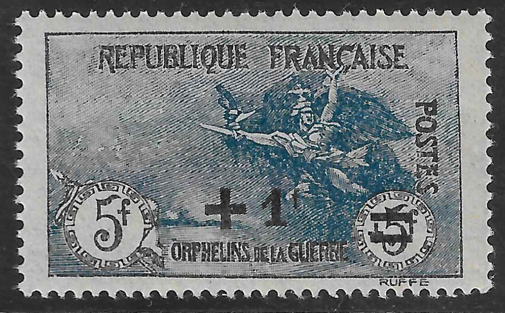 Superbe exemplaire du timbre de France n°169 - Orphelins - + 1F. sur 5+5 f. noir et bleu-gris. Neuf avec gomme d'origine sans charnière. Très bon centrage. Bord de feuille. Cote Yvert et Tellier 2025 = 450 €.