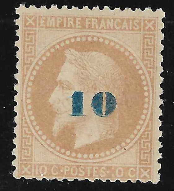 Très bel exemplaire du timbre de France n°34. 10 sur 10 c. bistre surcharge bleue. Neuf avec gomme d'origine, trace de charnière. Très frais. Cote Yvert et Tellier 2025 =  3 000 €