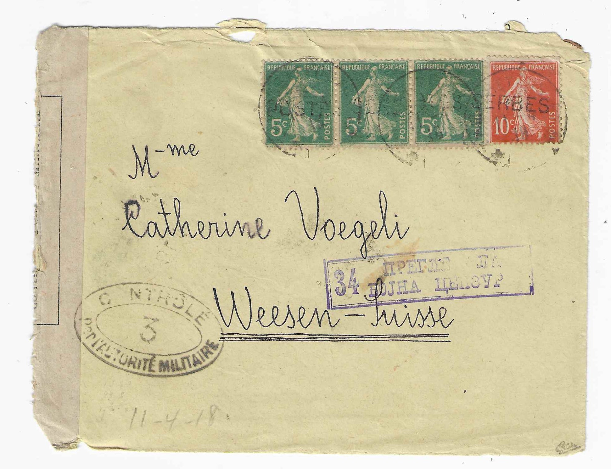 Très beaux exemplaires des timbres des Postes serbes n°1 et 2 - Semeuse 5 c. vert en bande de 3 exemplaires et 10 c. rouge. Oblitérés sur lettre recommandée avec cachets à date de la poste militaire française de 1918 pour Weesen (Suisse). Griffe POSTES SERBES sur les timbres. Cachet d'arrivée du 23 mai 1918 au verso. Lettre issue de l'archive Vögeli. Bel affranchissement. Cote Mayer 2021 = 265 € (uniquement pour un n°2 seul sur lettre).