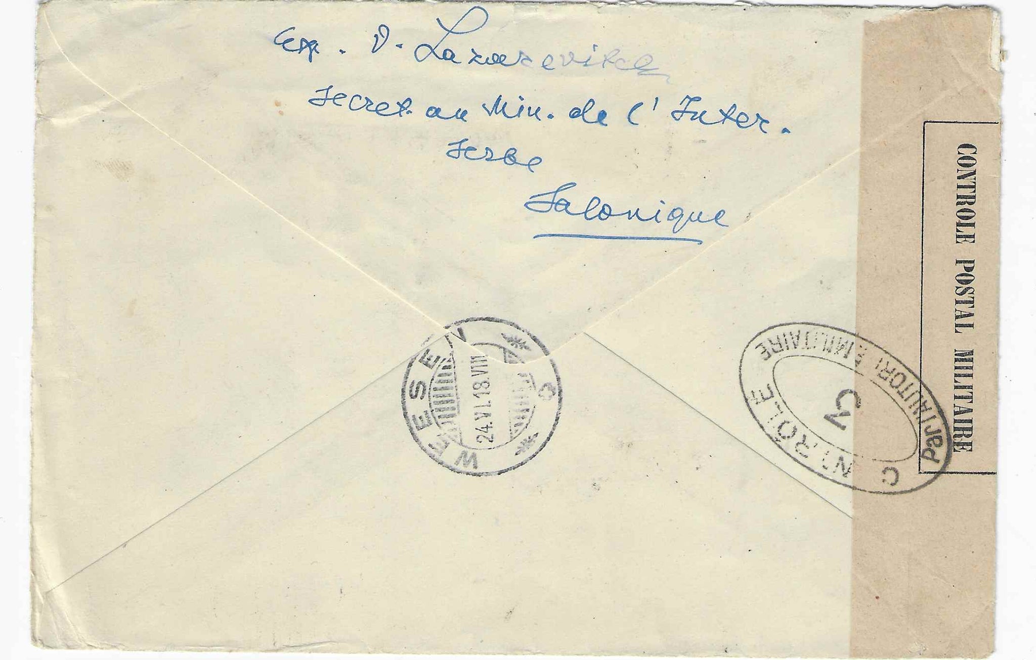 Très beaux exemplaires des timbres des Postes serbes n°2 et 8 - Semeuse 10 c. rouge et Merson 40 c. rouge et bleu. Oblitérés sur lettre recommandée avec cachets à date Trésor et Postes secteur 504 (armée serbe à Salonique) du 27 mai 1918 pour Weesen (Suisse). Sans la griffe POSTES SERBES. Cachet d'arrivée du 24 juin 1918 au verso. Lettre issue de l'archive Vögeli. Cote Mayer 2021 = 400 € (uniquement pour le n°8 seul sur lettre).