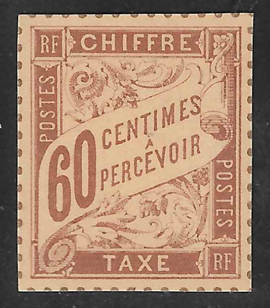 Superbe exemplaire du timbre-taxe - non émis - 60 c. brun sur paille - tirage spécial de 1900 sur papier bristol. Il s'agit d'un tirage de luxe de l'Atelier du Timbre, en vue de sa présentation à l'Exposition Universelle de 1900. Neufs sans gomme tels qu'émis. Rare. Quelques exemplaires connus.