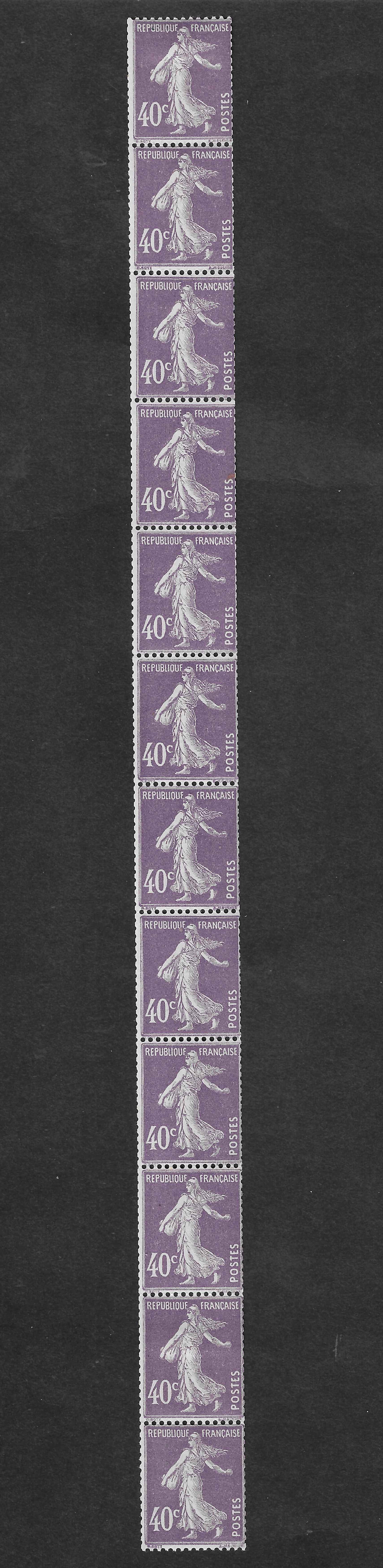 Très beaux exemplaires du n°236. SemeuseI, issu de roulette. Bande verticale de 11 exemplaires. Neufs avec gomme d'origine sans charnière, sauf 2 exemplaires neufs*. Cote Yvert et Tellier 2026 = 500 € (roulette n°26).