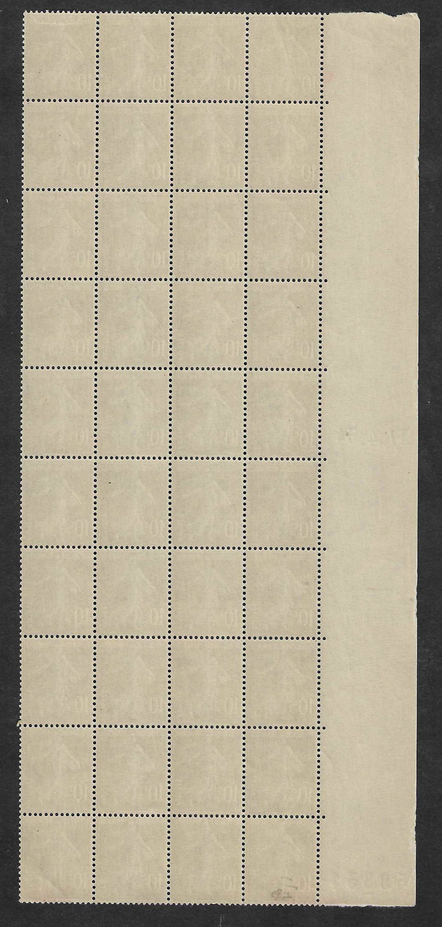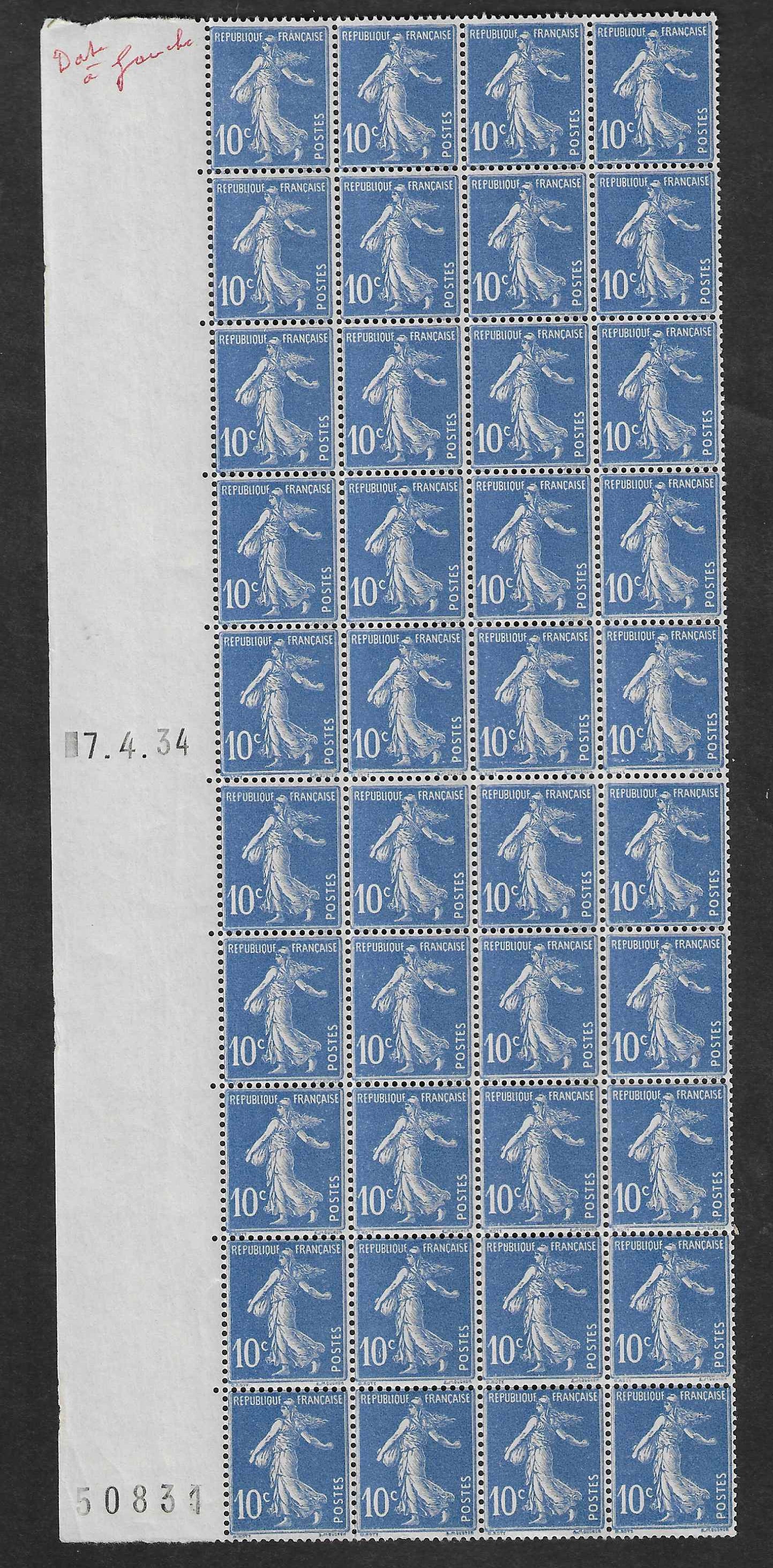Superbes exemplaires du n°278a. Semeuse, type IV, issu de roulette. Bloc de 40 exemplaires avec coin daté et numéro de feuille à gauche. Neufs avec gomme d'origine sans charnière. Très belle présentation.