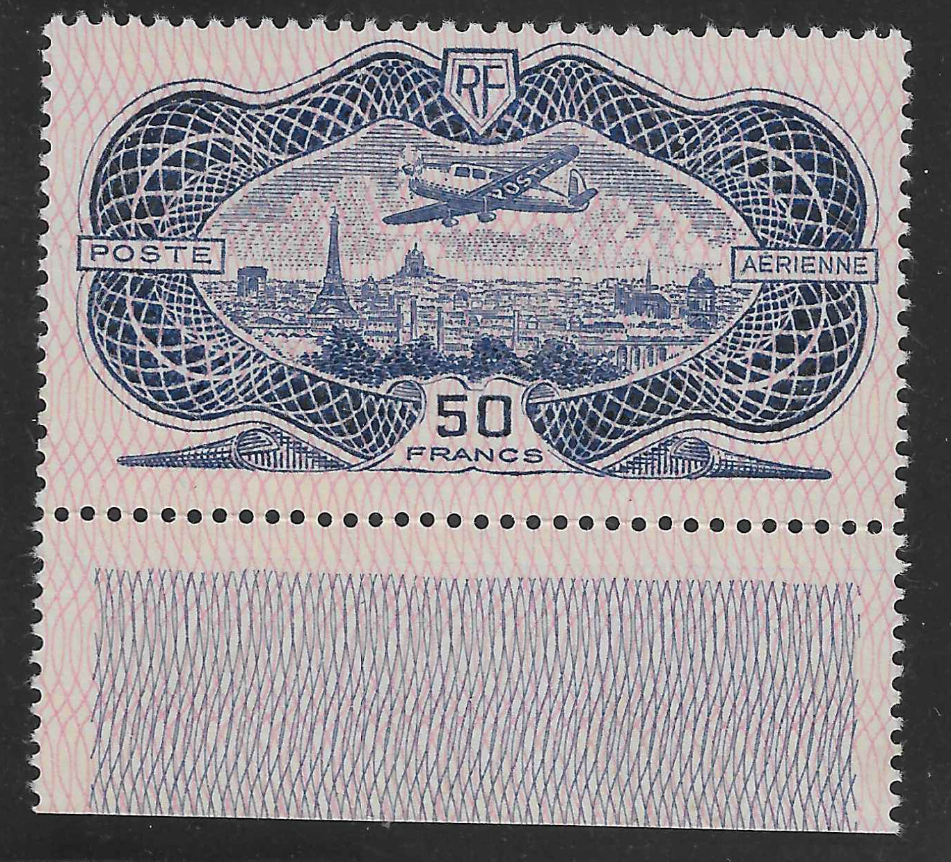 Superbe exemplaire du timbre de France de poste aérienne n°15. Burelé. Neuf avec gomme d'origine sans charnière. Bord de feuille. Cote Yvert et Tellier 2026 = 1 500 €.