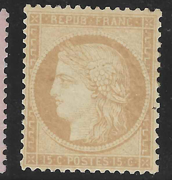 Très bel exemplaire du timbre de France n°59. Cérès - 15 c. bistre. Neuf avec gomme d'origine, infime trace de charnière. Cote Yvert et Tellier 2026 = 725 €.