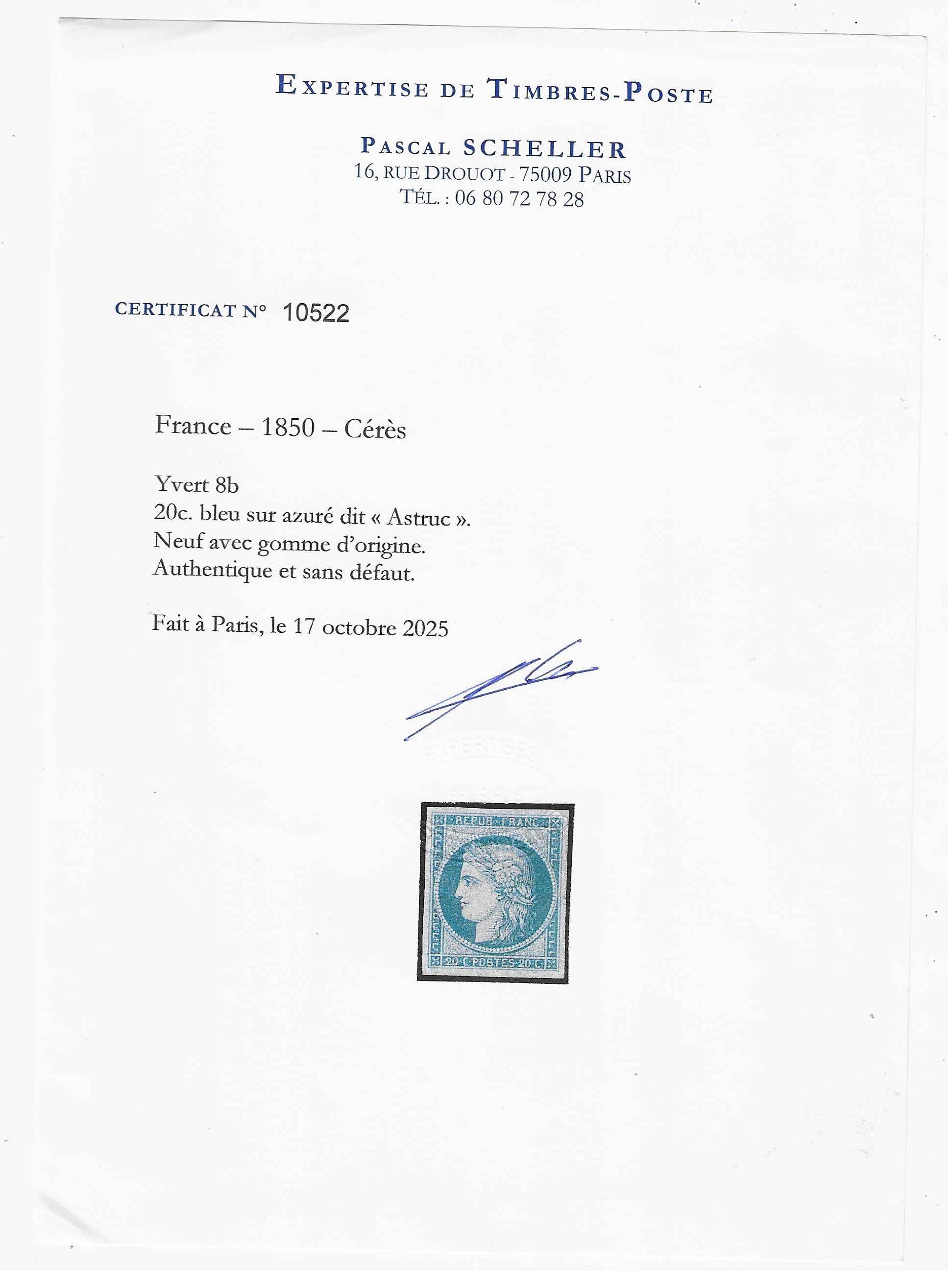 Le timbre est signé Brun. Il est accompagné de son certificat au format papier avec poinçon de la maison Calves et signatures des experts Christian Calves et Alain Jacquart, ainsi que son certificat Scheller. Les certificats vous seront adressés par courrier avec le timbre.