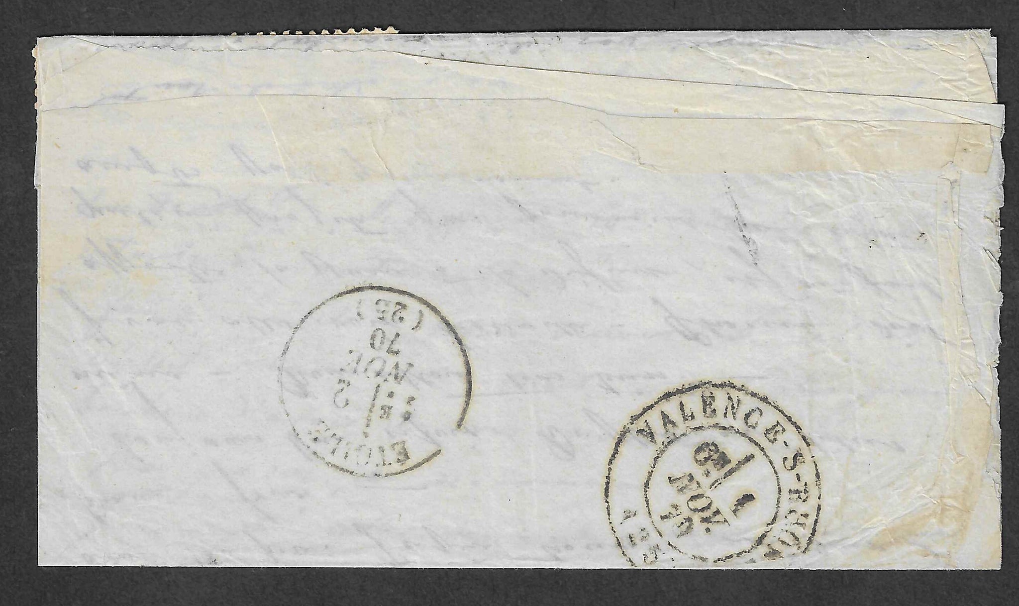 N°28B - 10 c. bistre. Paire horizontale. Oblitérée GC 432 sur lettre avec cachet à date du 28 octobre 1870 de Belleville pour Etoile (Drôme). Au verso : cachet de passage de Valence-sur-Rhône du 1er novembre 1870. Pli transporté par le ballon Le Colonel Charras.