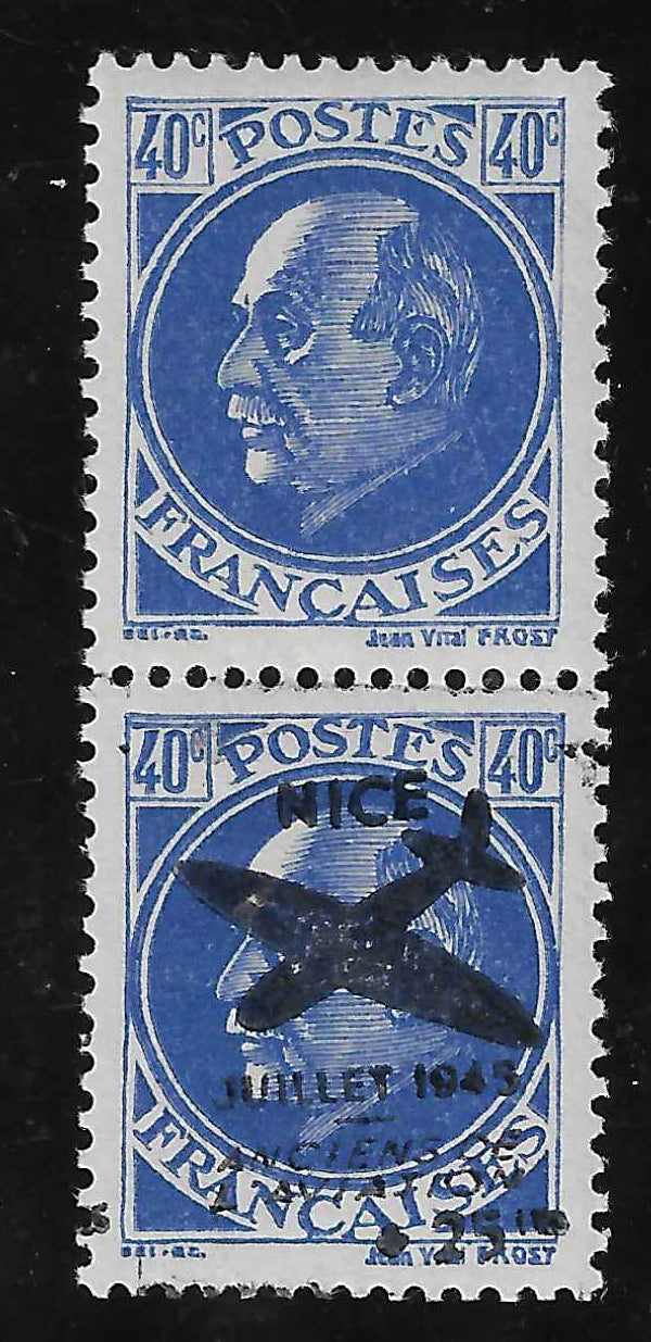 Superbe exemplaire du timbre de la Libération de Nice. Essai en noir sur n°14. Tenant à non surchargé. Neuf avec gomme d'origine sans charnière. Cote Mayer 2021 = 360 € +++ (la cote est celle de l'essai en noir, hors plus-value pour la variété tenant à normal).