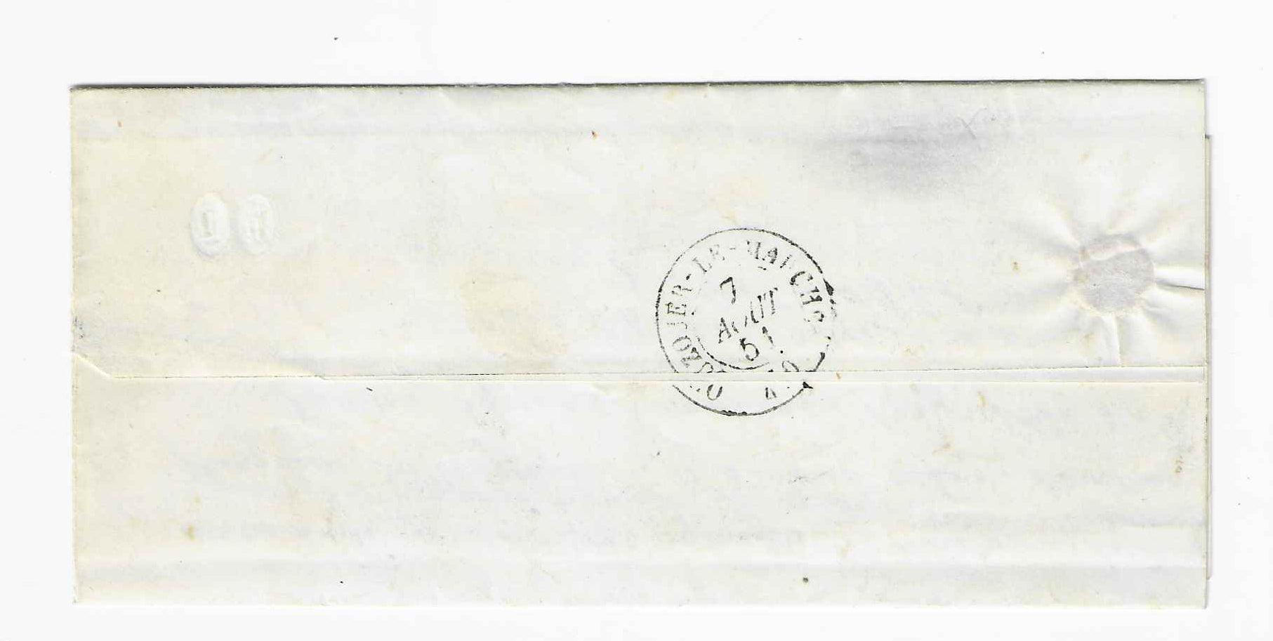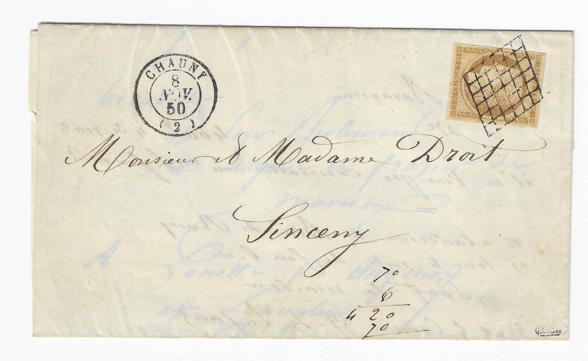 Superbe exemplaire du timbre de France n°1 - Cérès - 10 c. bistre-jaune. Oblitéré grille sur lettre avec cachet à date du 6 août 1851 de Ouzouer-le-Marché pour Ouzouer-le-Marché. Timbre très frais. Cote Yvert et Tellier 2023 = 775 €.