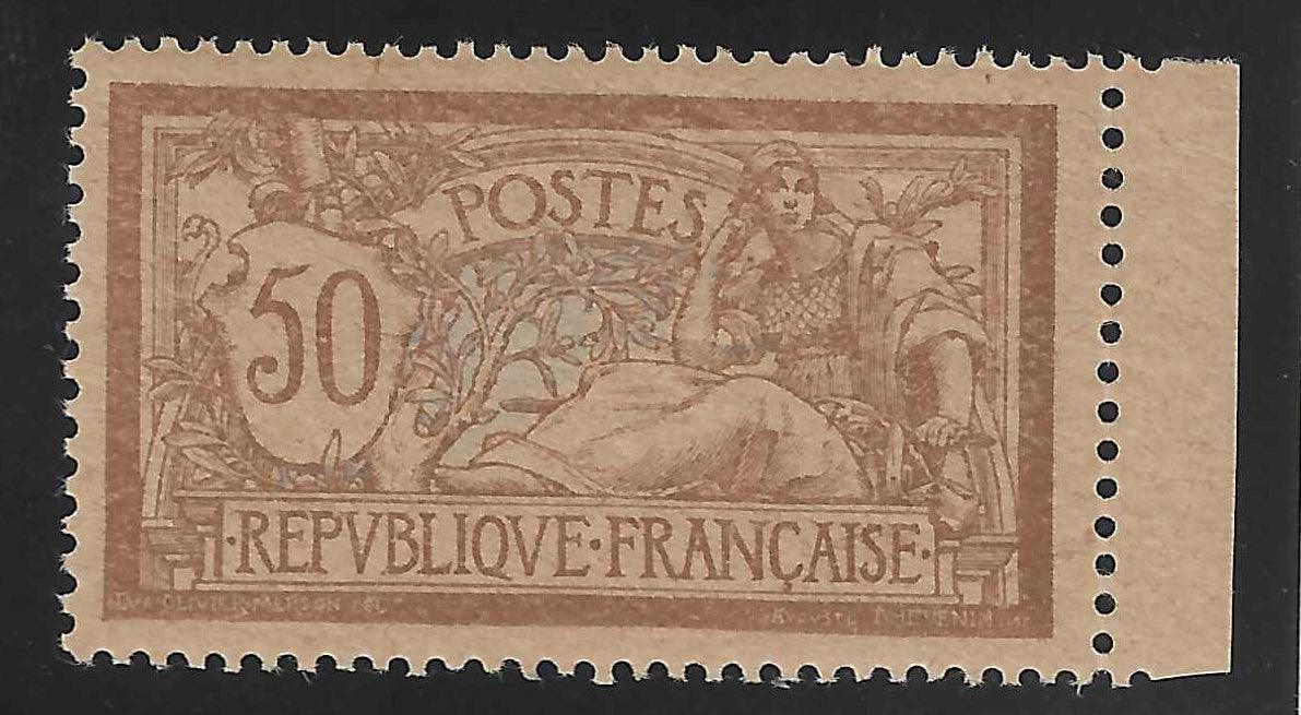 Superbe exemplaire du timbre de France n°120d - Merson - 50 c brun et gris. Neuf avec gomme sans charnière. Bon centrage. Bord de feuille. Cote Yvert et Tellier 2023 = 450 €.