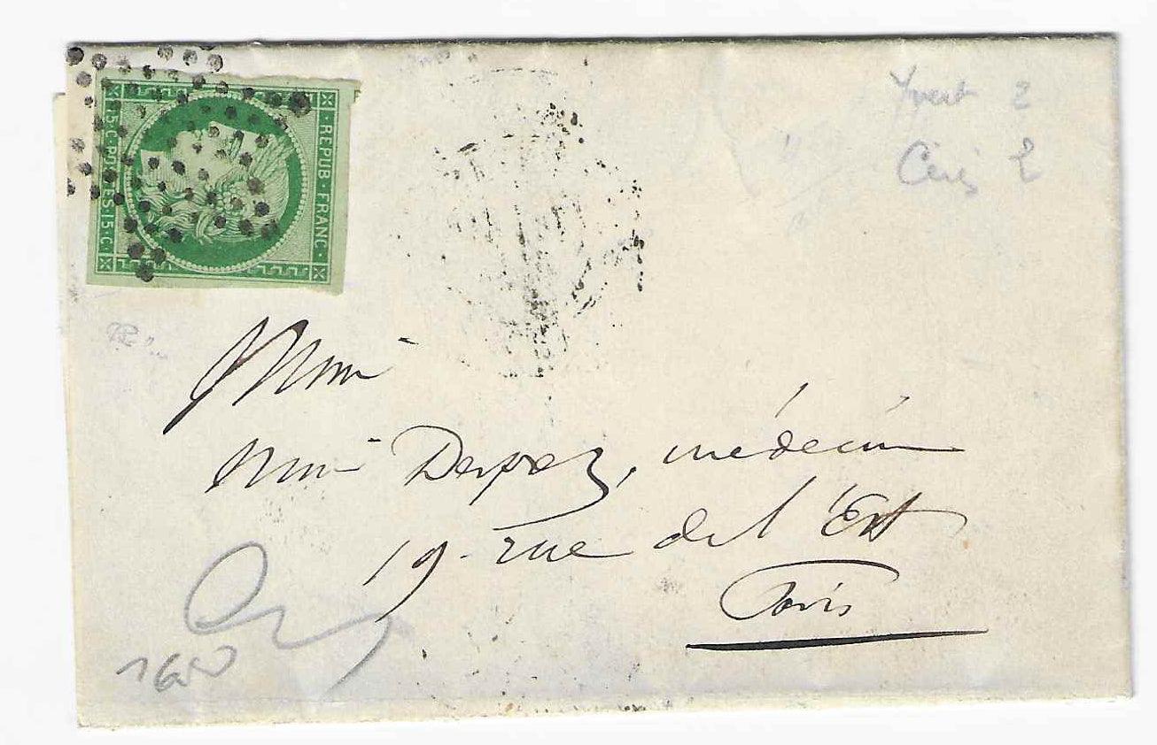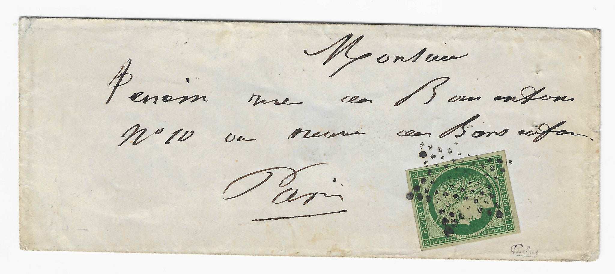 Très bel exemplaire du timbre de France n°2 - Cérès - 15 c. vert. Oblitéré étoile sur enveloppe de Paris pour Paris avec cachet d'arrivée au verso. Jolie pièce. Cote Yvert et Tellier 2025 = 1 850 €.