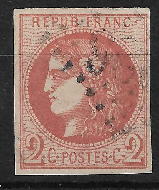 Superbe exemplaire du timbre de France n°40Ba - Emission de Bordeaux - 2 c. rouge-brique report 2. Oblitéré. Belle nuance et effigie dégagée. Cote Yvert et Tellier 2023 = 900 €.