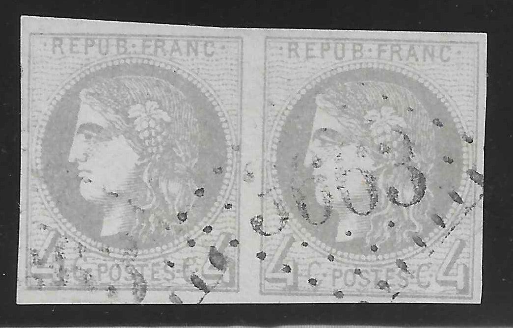 Superbe exemplaire du timbre de France n°41B - Emission de Bordeaux - 4 c. gris report 2 - en paire horizontale. Oblitérée gros chiffres. Jolie pièce. Cote Yvert et Tellier 2023 = 850 €.