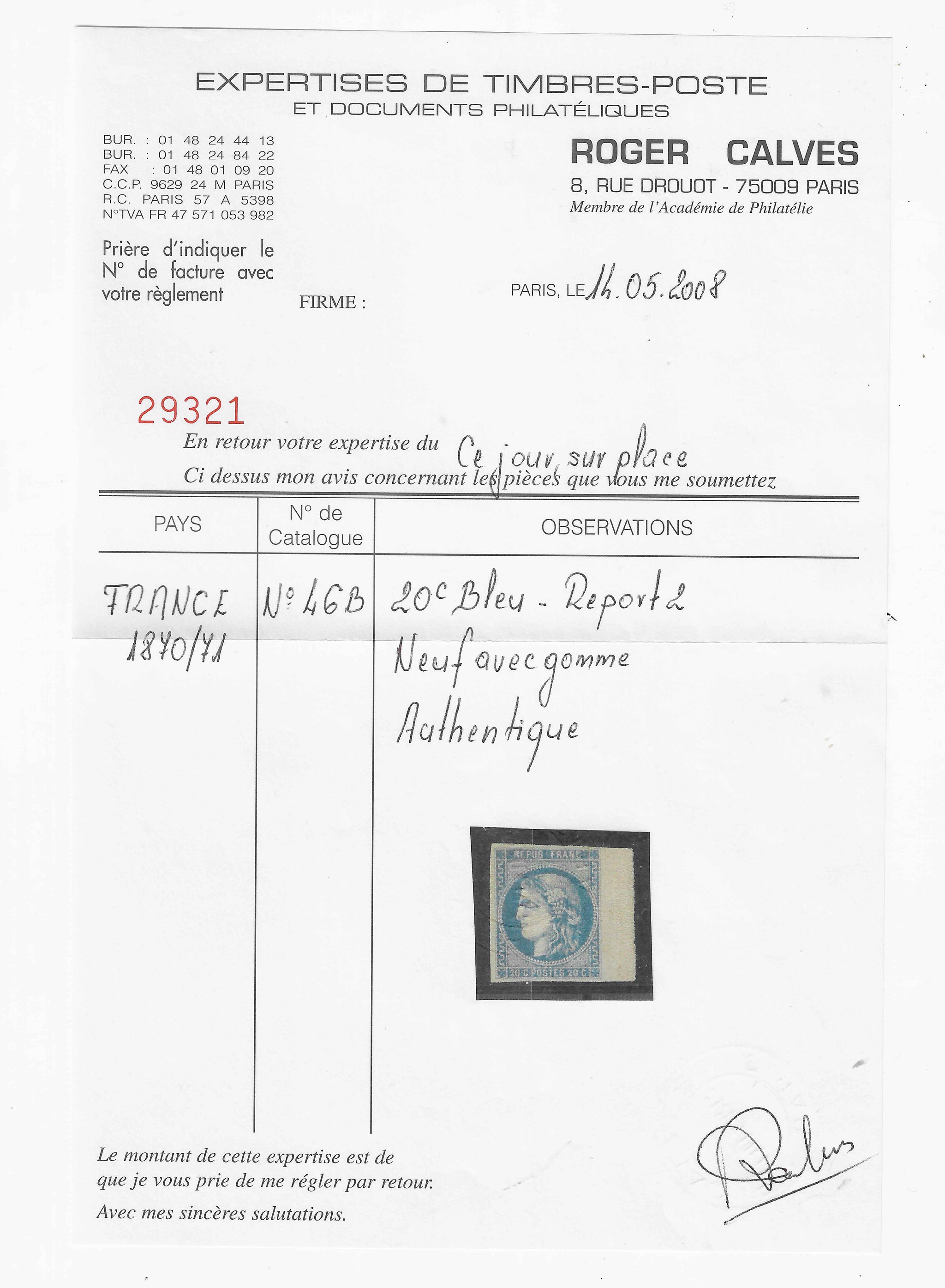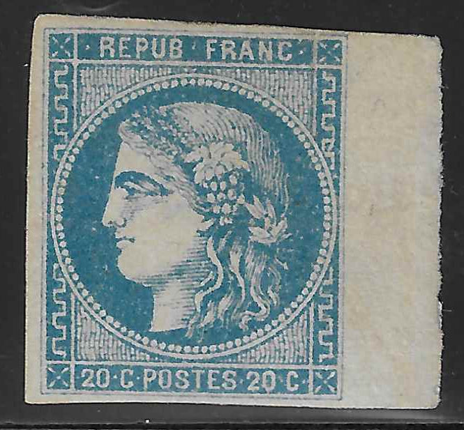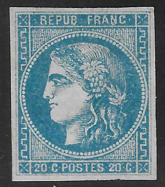 Très bel exemplaire du timbre de France n°46B. Emission de Bordeaux - 20 c. bleu type III report 2. Neuf avec gomme d'origine, trace de charnière. Cote Yvert et Tellier 2025 = 1 950 €.