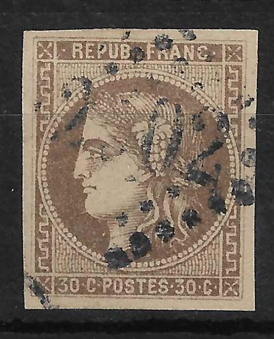 Superbe exemplaire du timbre de France n°47a - Emission de Bordeaux - 30 c. brun clair. Oblitéré. Belles marges. Cote Yvert et Tellier 2023 = 300 €.