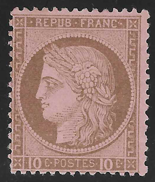 Très bel exemplaire du timbre de France n°54. 10 c. brun sur rose. Neuf avec gomme d'origine, trace de charnière. Cote Yvert et Tellier 2025 = 750 €.