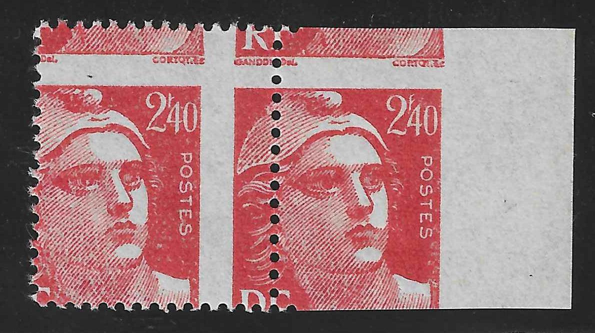 N°YT 714 - Marianne de Gandon - variété de piquage en croix en paire formant timbre non dentelé tenant à dentelé - neuf** - SUP - signée Calves