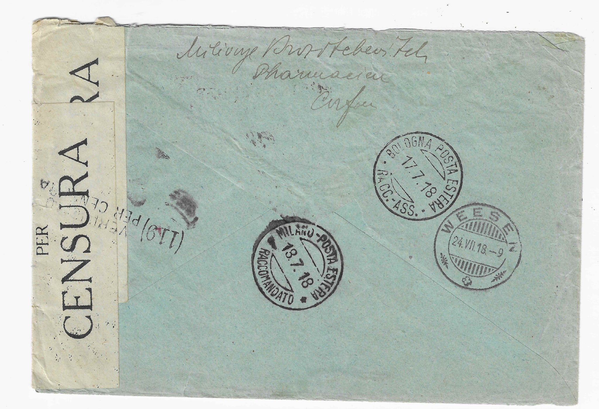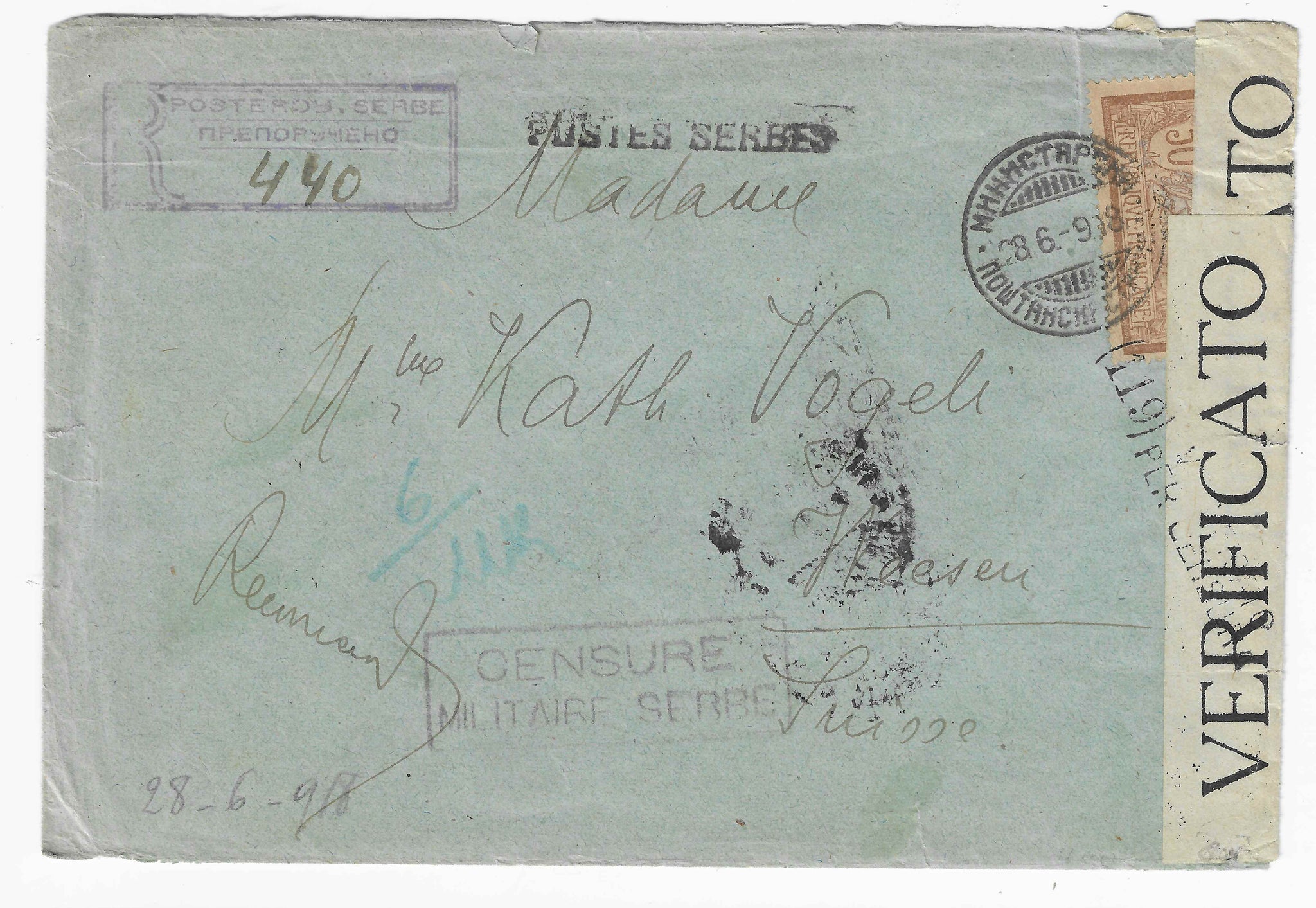 Très bel exemplaire du timbre des Postes serbes n°10a - Merson 50 c. brun et gris, papier GC. Oblitéré sur lettre recommandée avec cachet à date serbe du 28 juin1918 pour Weesen (Suisse). Griffe POSTES SERBES hors timbre. Différentes marques de censure serbes et italiennes. Cachet d'arrivée du 24 juillet 1918 de Weesen au verso. Lettre issue de l'archive Vögeli. Cote Mayer 2021 = 425 €.