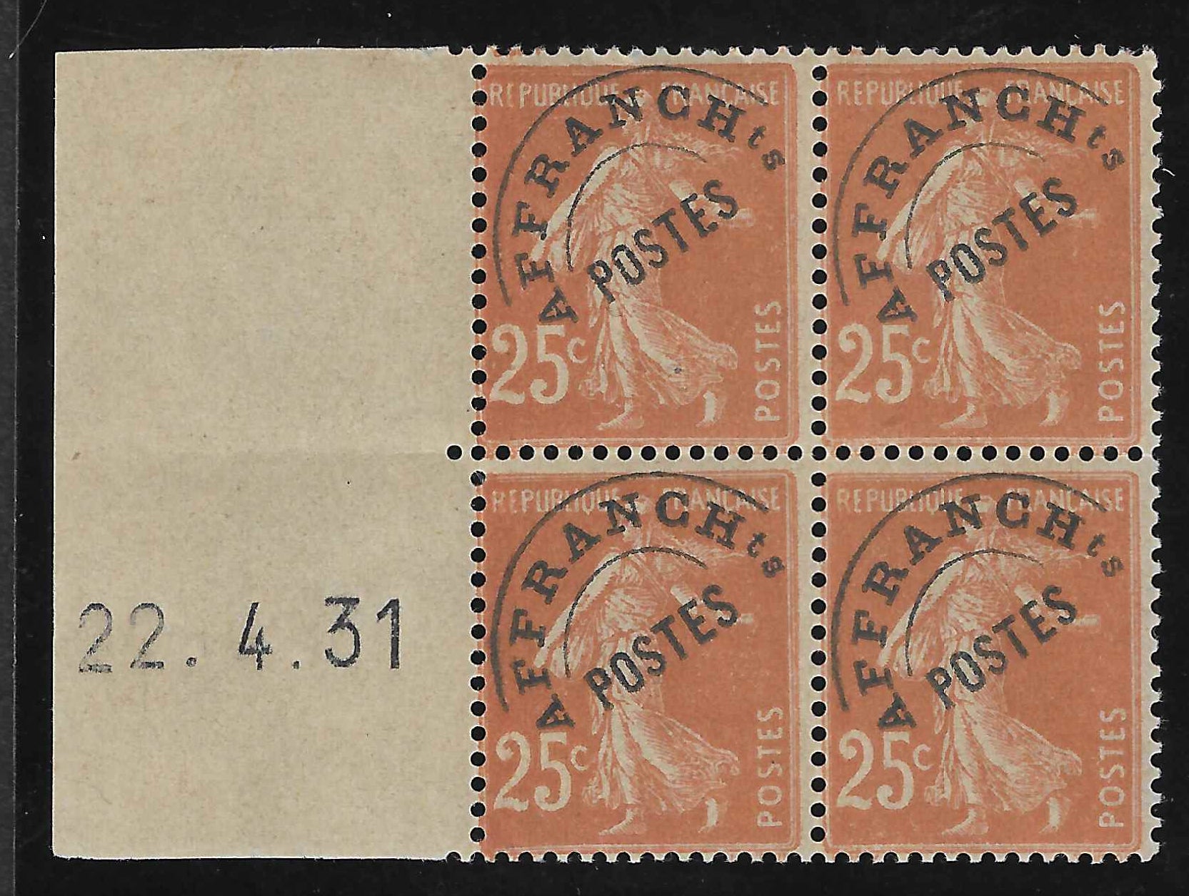 Superbes exemplaires du préoblitéré n°57. Type IIIC, issu de rouletteBloc de 4 exemplaires avec coin daté à gauche de 1931. Neufs avec gomme d'origine sans charnière. Cote Yvert 2026 = 650 €.